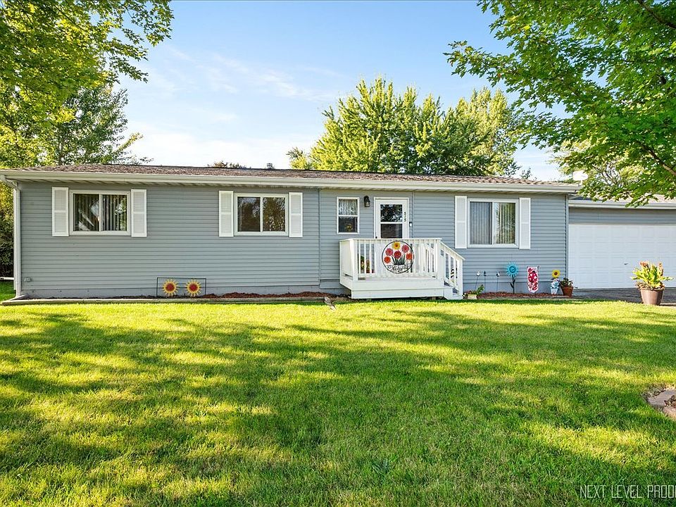 Welcome to the country in Shabbona, Illinois! This charming 3-bedroom, 2-bathroom ranch home, complete with an oversized two-car garage, is now available. If you're looking for affordable, single-level living, this could be the perfect home for you. Upon entering, you'll be greeted by an enclosed entryway leading into a spacious living room, kitchen, and dining area featuring vaulted ceilings and hardwood floors. The large country kitchen boasts oak cabinets, generous counter and cabinet space, a pantry closet, and a convenient island. It also provides direct access to the oversized 2 car attached garage. The expansive dining area opens to a mature backyard with a deck, fireplace for evening enjoyment and a fully fenced yard, including a shed for additional storage. Recent updates include new carpeting in the hallway and two bedrooms. The primary suite offers double closets, a full linen closet, and a private full bath. Two additional bedrooms provide ample closet space. The full basement features plenty of space for more finishing area however there is already 1 finished room with carpet, perfect for a fourth bedroom, hobby space or workout room plus the laundry area is also located here. Shabbona, Illinois offers quaint living with a lovely downtown area, the highly-regarded Indian Creek School District 425, and beautiful Shabbona Lake State Park, ideal for camping, fishing & hiking. The home also provides easy access to Route 39 and I-88. Welcome to comfortable, single-level living!