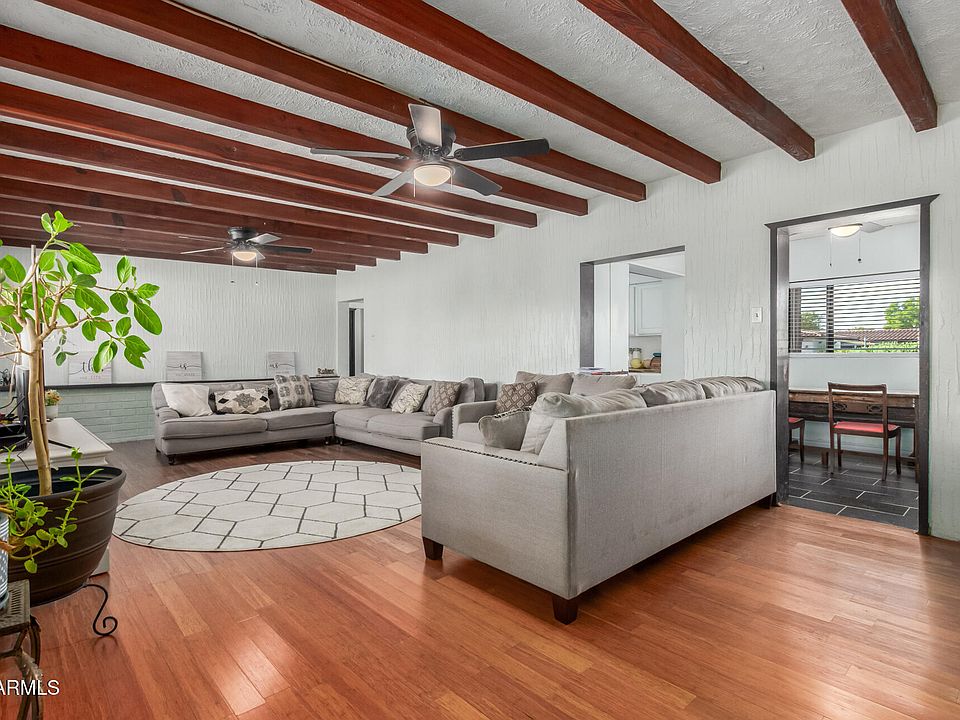 Spacious 4-bedroom, 2-bath home with an office/den in Chandler! Major items already completed for peace of mind: new roof, updated plumbing and sewer lines, new water heater, and pool filter. Step inside to a bright living area featuring wood-look flooring, plantation shutters, and charming beamed ceilings. The kitchen is equipped with white cabinetry, butcher block counters, and brand-new appliances, ready for everyday living. The primary suite offers plush carpet, a private ensuite bath, and walk-in closet. Outside, enjoy an oversized backyard with a covered patio, sparkling pool, green lawn, and a vegetable garden, plus fruit trees including kumquat, peach, blood orange, pomegranate, lime, lemon, and orange.