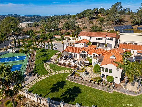 A remarkable blend of luxury, privacy, and versatility awaits in this stunning Arroyo Grande estate. Perfectly situated on 2.8 serene acres, this exceptional property spans approximately 7,840 sq. ft. of living space and includes a magnificent 5-bedroom, 7-bath main residence plus a 1,200 sq. ft. 2-bedroom, 2-bath ADU. Inside the main home, expansive open-concept living spaces flow seamlessly from the grand entry and formal living room to the dining area and chef-inspired kitchen—complete with top-of-the-line appliances, an indoor BBQ, granite countertops, and a large island with custom cabinetry. The elegant primary suite features dual walk-in closets, a spa-style bathroom, and an adjoining sitting area. Each additional bedroom is a private ensuite, beautifully designed for comfort and style. Thoughtfully designed for both entertaining and everyday living, the home also includes a family room, private office, game room, media room with home theater, exercise room, and an impressive temperature-controlled wine cellar. The 5-car garage is complemented by four additional spaces currently housing recreational vehicles, plus a detached 2-car pull-through garage used as a spacious workshop. Outdoor living is resort-inspired, with a pool, spa, outdoor kitchen, fireplace, pizza oven, and a pool house complete with living space, kitchen, and bathroom. Enjoy tennis, pickleball, or basketball on the courts, or simply relax among the multiple patios and sitting areas surrounded by lush, professional landscaping, hardscape, and a small vineyard. The stylish ADU Casita offers its own 2-car garage and has been a highly desirable vacation rental, featuring an open floor plan with a bright living room, full kitchen, and two large ensuite bedrooms. This gated solar-powered estate captures panoramic views of the surrounding hills and California coastline, offering the ultimate in luxury living. Just minutes from the charming Arroyo Grande Village, San Luis Obispo, and the Central Coast’s renowned beaches, dining, and wineries—this extraordinary property is both an entertainer’s paradise and a private retreat with the bonus of the separate income-producing Casita!