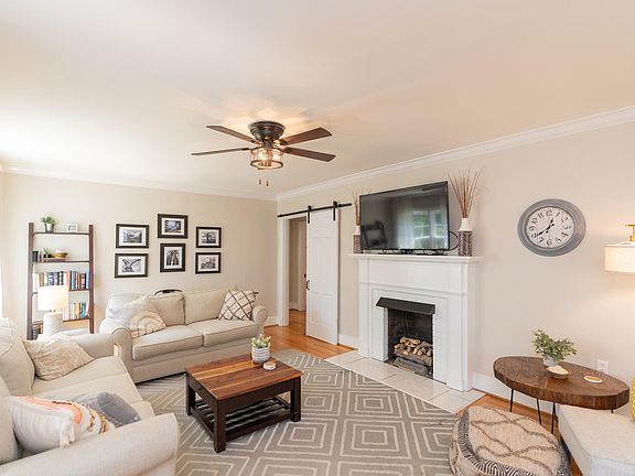 Upon entering from the covered front porch, you appreciate the abundance of natural light and neutral color palette in the living and dining rooms. Off of the dining room is a quaint sunroom with it's own fireplace, the perfect place to sit in a cozy chair with a good book or take in the view of your large backyard. In the well-appointed kitchen, we find quartzite counters, a gas range, custom tile backsplash and floating shelves. From the kitchen, glass paneled French doors invite you onto the large screened porch, featuring a vaulted ceiling, durable slate tile, its own large fireplace, and entry onto a stone walkway that leads into the backyard.