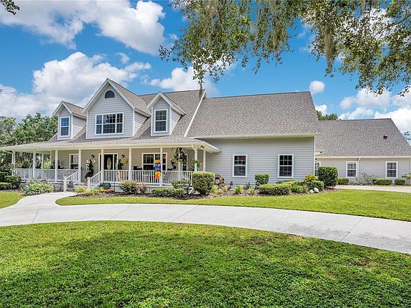 Welcome to 5150 Banana Point, a spectacular custom Southern estate set on 1.318 acres of tranquil privacy beneath a canopy of majestic century-old oaks. Thoughtfully designed and meticulously maintained, this 5-bedroom, 3.5-bath residence offers flexible living with a 22x13 media room—complete with a closet—that easily serves as a spacious 6th bedroom. Adding to its appeal, the property features an attached 1,300+ sq. ft. cottage, seamlessly blending timeless Southern charm with modern comforts—an ideal setup for multi-generational living, extended guests, or a private retreat for a nanny or caregiver. The main home showcases solid oak finishes, vaulted ceilings, and a stone propane fireplace with remote control, creating a warm and inviting atmosphere. The gourmet kitchen offers a large island, breakfast nook with a bay window overlooking the pool (with attached salt system), and easy flow into the dining room. The downstairs primary suite features dual vanities, a jetted hydro-massage tub, custom walk-in shower, and oversized closet. Upstairs, you’ll find three spacious bedrooms, a full bath, a media room or versatile bonus/game room. Step outside to your private resort-style oasis with a heated, screened pool and spa (recently resurfaced with LED color-changing lights), expansive 47x50 pool enclosure, child safety fence, and a full outdoor kitchen with propane hookup—perfect for entertaining. The attached cottage offers a full kitchen, large bedroom, bath with walk-in shower, soaring 10’ ceilings, and direct pool access. This home is loaded with thoughtful upgrades, including: new roof (2023) and cement Hardie siding; two new 50-gallon water heaters (2025); whole-house Generac generator with owned underground propane tank; water softener system and irrigation filtration system (2024); double-pane windows & automatic sprinkler system; vented hurricane/storage room for added peace of mind; three HVAC systems (2 years, 7 years, and original—recently serviced); home is pre-wired for solar panels; new light fixtures and ceiling fans throughout, and two septic systems and private well. Located just minutes from the Florida Turnpike, with easy access to Orlando, Tampa, and The Villages, this retreat is also only 3.9 miles from The Villages’ newest expansion (Middleton, Eastport, and the planned Wellness Village), 20 minutes to historic Mount Dora, and 45 minutes to Orlando International Airport and world-famous theme parks. Blending modern updates with timeless character, this home offers a rare opportunity for private, resort-style living in the heart of Central Florida. Schedule your private showing today.