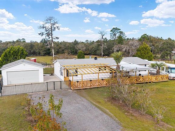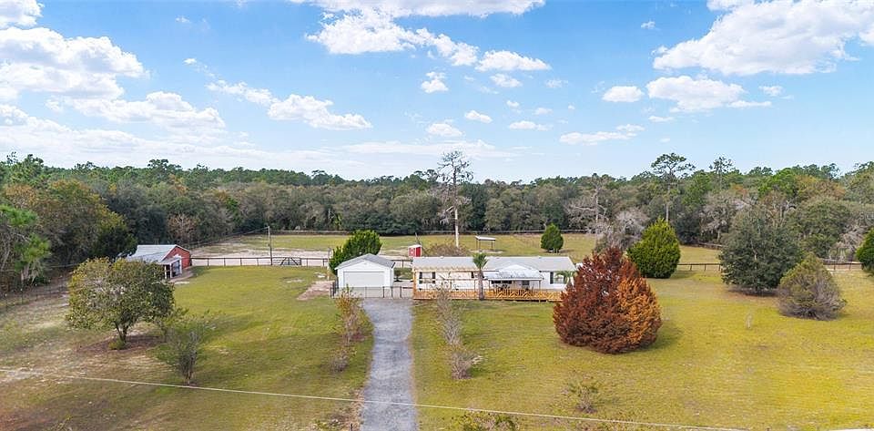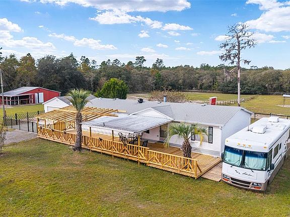 Turnkey 5-Acre Farm in Morgan Farms – Renovated, Private, and Ready for Your Animals. Welcome to your dream mini-farm in the heart of horse country! Tucked away on a private dead-end road in the sought-after Morgan Farms community, this beautifully renovated 3-bedroom, 2-bathroom home sits on 5 fully usable acres with scattered shade trees, fenced paddocks, and room to roam. This 1,620 sq ft-renovated home offers stylish, move-in ready living with luxury tile bathrooms, a bright, open layout, and a brand-new full-length front deck perfect for morning coffee or evening sunsets. The kitchen is a showstopper—completely updated with all new stainless steel appliances and modern cabinets & countertops, ready for everyday cooking or entertaining. The split bedroom plan adds privacy, while the spacious living and dining areas are ideal for gathering with friends and family. Step outside and enjoy all the thoughtful improvements made for both humans and animals alike. The two large paddocks are perfect for horses or livestock, and the 2-stall barn includes tractor/equipment storage and room to expand. A fancy chicken coop adds charm and utility, offering a great start for your self-sustaining lifestyle. Cool off in the above-ground pool, relax in the hot tub, or enjoy gardening and outdoor projects with the detached 2-car garage and additional storage space. This property is a nature lover’s paradise—just minutes to Goethe State Forest, where you can ride or drive for miles on scenic trails without ever touching a main road. It's also only 26 miles to the World Equestrian Center, 17 miles to HITS Horse Showgrounds, 29 miles to Crystal River, and a short drive to the Gulf of Mexico, making this location ideal for both equestrians and outdoor adventurers. Whether you're looking for a full-time homestead, winter farm base, or peaceful retreat, this well-laid-out property offers privacy, function, and flexibility with all the hard work already done.