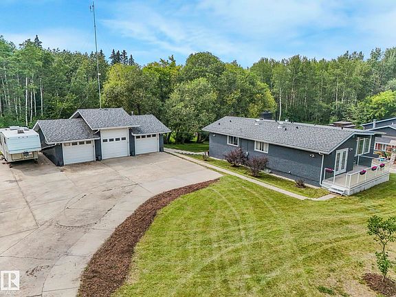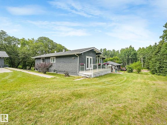 Located centrally between Edmonton, Devon and Spruce Grove, this secluded 5-acre property is not in a subdivision and is boarded to the north by a 4-acre reserve. This well-maintained walk-out bungalow features an open floor plan, bright island kitchen with ample cabinetry, four bedrooms, three bathrooms and a family room with a wood-burning fireplace. Sliding glass doors leading to an elevated deck. The fully finished basement offers a wet bar, an additional bedroom, office & flex space, and walk-out access from the second family room to a patio with a hot tub. The home has undergone many upgrades throughout. The yard contains RV Parking next to triple heated garage (36 x 24) on the paved/concrete drive, an in-ground pool, a heated workshop/greenhouse (52 x 36) with garage bay, a hip-style barn with loft (22 x 16), and a huge storage shed (40 x 26). Enjoy viewing this secluded peaceful property.