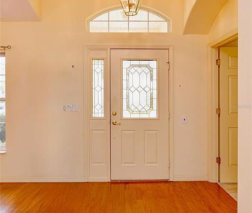 Welcome home to your dream 55+ community in beautiful Lake County! Royal Harbor offers dozens of amenities and there is a club for just about any interest! See the list of community offerings attached to this listing! This home offers four full bedrooms, Two baths, full three car garage, a screen enclosed pool with both covered and open deck Space. The front door is screen enclosed for added weather and bug protection. Upon entering this home you will see open living space with beautiful wood floors and high ceilings. The floorplan offers a three way split with the primary bedroom off to the left back of the home, the fourth bedroom off to the left front and bedrooms two and three on the far right side of the home. The kitchen offers 42" wood cabinets, granite countertops, new stainless steel appliances, a 10' breakfast bar, laundry room access and a 10x9 eating space with pool views. The Primary bedroom is 19x13 and offers a large walk in closet, Electric Wall heater, dual sinks, linen closet, soaking tub, a separate shower and a frosted window for natural light. Community has a fishing pier on Little Lake Harris and offers RV/Boat storage. This home is ready for a new owner, call for your private showing today!