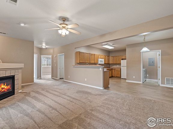 Enjoy easy living in this main floor condo at Pinnacle at T-Bone Ranch. This 2-bedroom, 2-bath home features an open floor plan with 9' ceilings, a spacious great room, and a kitchen designed for functionality and flow. The kitchen is equipped with 42" cabinets, range, microwave, plus a brand new refrigerator and dishwasher. The primary suite includes a large walk-in closet and full bath. The great room offers a gas fireplace and opens to your own private covered patio with an added storage closet. Inside, you'll appreciate the all new flooring throughout for a fresh, move-in-ready feel. A one-car attached garage provides convenience, with plenty of additional parking available outside. The HOA covers water, trash, lawn care, snow removal, exterior maintenance, and hazard insurance, so you can enjoy low-maintenance living. Community amenities include a pool and fitness area. Conveniently located in West Greeley, this home is close to shopping and dining at Centerplace and St. Michael's Square, near the new UCHealth Greeley Hospital, and offers easy access to Highways 34 and 402 for commuting or weekend getaways.
