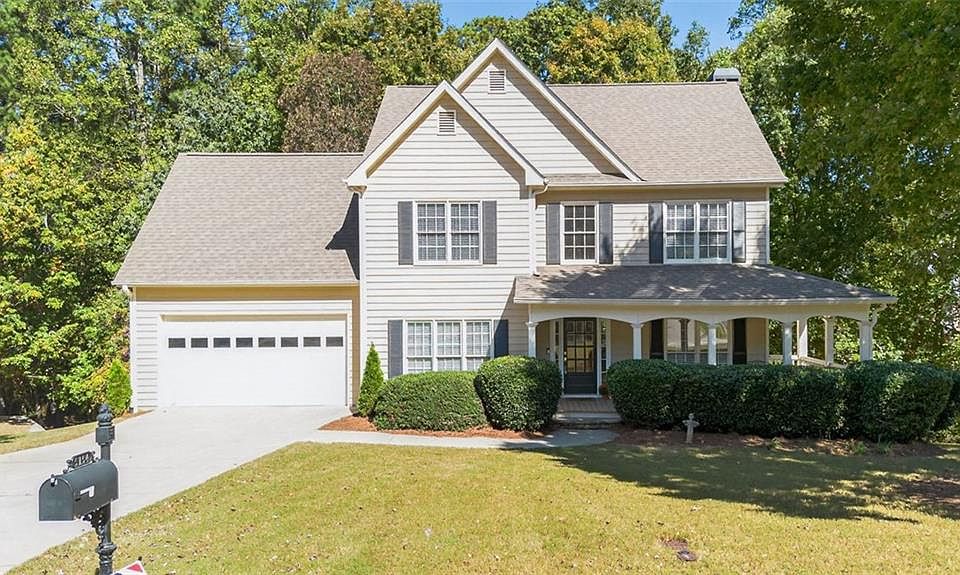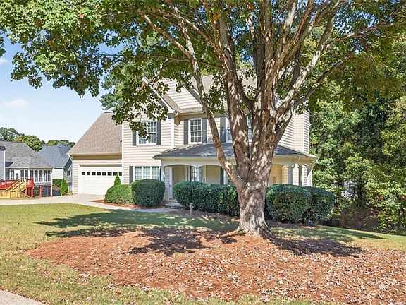 This beautiful, well-built home stands apart from typical production builds, offering exceptional quality and character throughout. From the inviting wrap around rocking chair front porch to the thoughtful architectural details, craftsmanship and care are evident in every corner. Fresh paint inside and out, the home feels bright and welcoming. Refinished hardwood floors grace the foyer, kitchen, and powder room, while brand-new carpet adds comfort to the living areas and bedrooms. The spacious family room features a stunning stacked-stone fireplace with gas logs — a perfect gathering spot on cool evenings. The sunny kitchen is a true highlight, featuring granite countertops, stainless steel appliances, custom cabinetry, and a cheerful eat-in breakfast area overlooking the wooded backyard. Elegant moldings and solid construction showcase the home’s superior build quality. The large primary suite provides a peaceful retreat with its own ensuite bath, and upstairs you’ll find three additional bedrooms, including a huge bonus/bedroom offering flexible living space. Downstairs, a full unfinished basement — already stubbed for a bath — offers endless potential for future expansion or storage. Set on a large wooded lot in a wonderful sought after neighborhood, this home blends timeless craftsmanship, comfort, and charm — a truly distinctive place to call home. Owners are related to agent.