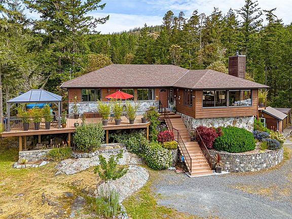 3 Houses +,Situated on over 11 parklike acres between Sooke and the Western Communities (10 min each way) with commanding views of Sooke Harbour and the Olympic Mountains. Three separate homes, each with privacy and access via a wrap-around driveway. Main home offers 2,000 sq ft of single-level living, 3 beds plus den, tile/hardwood floors, open kitchen with large island, living room with fireplace, and over 900 sq ft of decks for entertaining. First rental is a 3-bed, 1-bath, 1,150 sq ft older home—ideal for family or home business. Second rental is a 3-bed, 1-bath deregistered mobile with 1,000 sq ft and a 7’10” unfinished daylight basement with woodstove. All homes on separate wells and water systems. Also on site is an income-producing cell tower (discreet and disguised, $1,500/mo). Approx. $6,000/month total income. Sooke allows for 4 homes per 10 acres, development potential. Located at 5154 Sooke Rd (no sign; by appointment only). Listed at $2.49M.