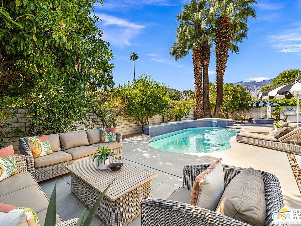 Wow! Mid-century MAGIC circa 1962, built for the Palm Springs good life on the South end of town where pool, mountain, and fairway views come together. Positioned between the 6th and 7th fairways of the Legend Course at Tahquitz Creek Golf Club, this home has no HOA nor land lease and captures the very essence of desert resort living. This gorgeous architectural home has been thoughtfully updated, blending timeless character with modern livability. Vaulted ceilings and a dual sided vintage block fireplace anchor the living and dining areas, while the all new kitchen takes center stage for entertaining, complete with an oversized island and a long buffet bar with beverage fridge overlooking the fairway. Outdoor living shines under swaying palms and mountain views, with a sparkling pool and spa accented by a soothing waterfall. Currently eligible for a short term rental permit, this home offers flexibility for both full time residents and investors alike. Don't miss the fabulous conversation areas tucked away and perfect for watching golfers tee off, definitely a unique part of this special home. All bedrooms enjoy excellent separation. The primary suite opens to a patio and features fantastic finishes, a separate tub and shower, and a walk in closet. Guest Bedroom 2 opens to the pool area and shares an updated bath with Guest Bedroom 3 which includes its own sitting area. The list of updates both inside and out is extensive, including new pool decking, circular fire pit, outdoor shower, and outdoor kitchen, plus a new roof, HVAC, smooth stucco, updated electrical and lighting, and epoxied concrete floors underfoot. Take the Matterport Virtual Tour for a better sense of flow.