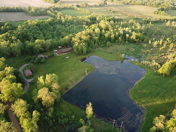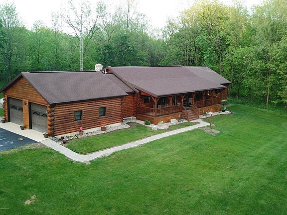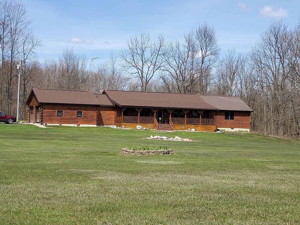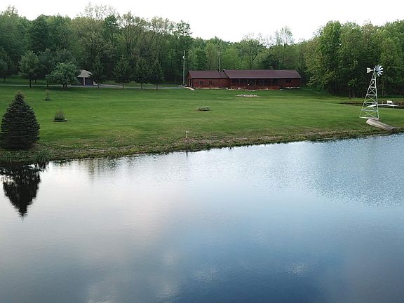 You owe it to yourself to take a look at this property! 27 beautiful, secluded acres with a large, stocked pond and 2 pole barns. This rustic knotty pine walled lodge is all on one level and has been impeccably maintained. If you watch, you might just catch a glimpse of a dinner train passing through on the far side of the property. There are 3 to 4 bedrooms, an open floor plan, 2 1/2 bathrooms and a sun room that is just stunning. The whole house on demand generator and high efficiency furnace are just a few of the upscale features. Hickory custom built cabinets adorn the home and oak cabinets line the attached garage. The front pole barn has it's own well, septic and electric. It may not have a basement, but the 4 foot concrete, lighted crawl space is perfect access and storage. The wood burner in the family room will keep you toasty all winter long. The seller says bring me an offer, the sunny south and family are calling my name. The propane tanks, carports and shed stay.
