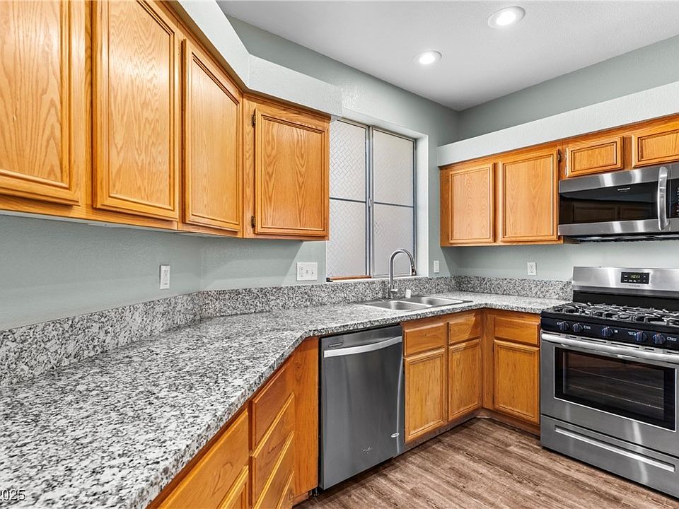 Move-in ready updated 2-bed, 2-bath upstairs condo with a detached 1-car garage! Stainless steel appliances, new garbage disposal, new shower heads, granite kitchen counters, and updated vinyl flooring throughout! Open layout, pantry storage, vaulted ceilings in the living room, and a spacious private balcony perfect for relaxing or entertaining. The community offers resort-style amenities, including a sparkling pool, fitness center, clubhouse, and covered parking. Ideally located just minutes from the Las Vegas Strip, 15 & 215 freeway, Downtown Summerlin, Red Rock Resort & Casino, Allegiant Stadium, and T-Mobile Arena. Whether you’re seeking a full-time home or a Las Vegas getaway, this condo offers the perfect blend of style, comfort, and access to the best of shopping, dining, and entertainment!