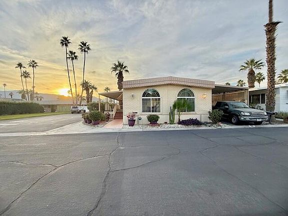 Great location, corner lot on this 1972 manufactured home, 55+ community Palmdale Estates Indio. 2 bedroom 2 bath with a living room and den area, great size patio facing a beautiful palm tree & mountain view. Pool area and clubhouse right across the street. Comes with some furniture included and appliances. Indoor washer & dryer. 2 storages. There is also a section at the rear of the park to park your RV this would make a great vacation spot. or fulltime residence. Owner occupants only. Must be approved by the park. Space rent $706. plus gas & electric. Call for a showing today!