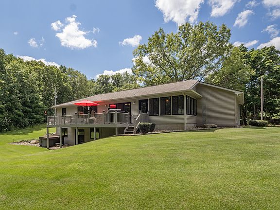 Highest & Best due Wed 7/24 @ 5PM. The moment you drive down the winding 500ft. driveway you will be taken back by the beautiful landscape surrounding this custom built walkout Ranch home. The 30x40ft. pole barn is great for entertaining, hobbies & storing your toys. Complete remodel in 2021. Vaulted ceiling with a decorative beam in the main living space with a slider that walks out to a large composite deck. Main floor primary suite with a large walk-in closet, main floor laundry & an attached 3 season room for extra living space. Lower level has a large family room with a Harman pellet stove, large gym, slider leading to a hot tub in your secluded backyard. Wired for a generator. Ring doorbell & security light on garage. Home sits on 3.51 acres & is minutes from Plainwell & Kalamazoo.