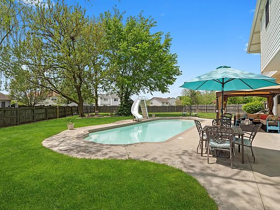 BACKYARD OASIS - INGROUND HEATED POOL! Light the tiki torches & pour yourself a margarita because your summer vacation begins at HOME with this 3 bedroom 2.5 bath beauty! There's no need to book a flight, when you can enjoy a HEATED IN-GROUND POOL w/ waterslide from your very own FULLY FENCED IN backyard on nearly half an acre (0.4)! Tucked away on a quiet cul-de-sac with no traffic in the Monee Fairgrounds neighborhood, all the big ticket items have already been taken care of; NEW ROOF/gutters (2024), NEW FURNACE (2022), new water heater (2024) & more! Soaring vaulted ceilings, skylights, hardwood laminate floors & open staircase; this home features a great layout w/ main floor living room AND family room w/ cozy fireplace. Kitchen has been updated w/ custom tile backsplash & newer appliances (2015). Sliding glass doors lead to your backyard oasis; concrete patio w/HEATED salt water pool w/ sand filter & mesh cover! Upstairs, you'll be pleasantly surprised by the OVERSIZED PRIMARY SUITE w/ walk in closet & spacious ensuite bathroom w/ double sinks. Main floor laundry has been converted into a mud-room just off the garage, could easily be converted back if needed. Basement is UNFINISHED with limitless potential, plumbing already roughed in for another bath. Don't wait long to schedule a private showing!