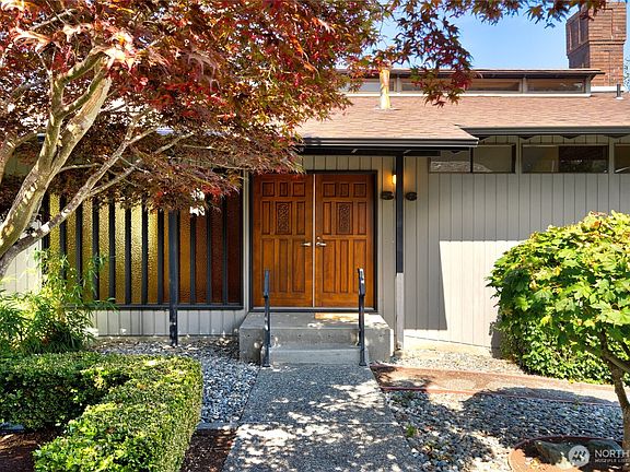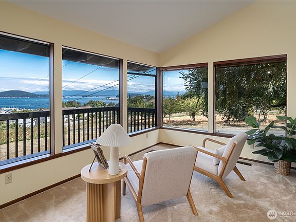 Mid-century charm w sweeping 180 degree views of Anacortes at 516 39th St. This architectural gem is perched at the top of a sweeping hill with one of a kind views of the Anacortes Marina, Baker & the downtown. You are invited in w/ a courtyard that provides access to both the detached 2 car garage & entry way. Step in & feel immersed in the views w large windows, vaulted ceilings, & plenty of space for entertaining. Main level includes cozy den with fenced patio+deck access, galley kitchen w/ bar space, living room & powder bath. Lower level includes primary w walk-in closet + ensuite, 3 bedrooms + full bath & laundry. From the warm wood paneling to amber windows - this thoughtful mid-century gem is just waiting for you to call it home.