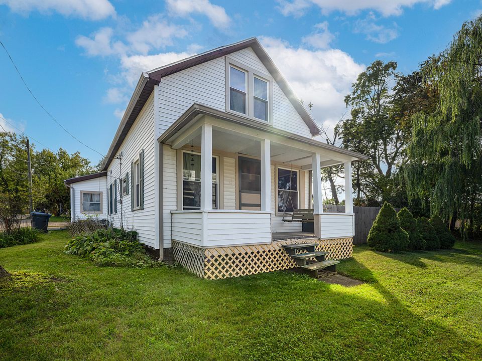Located on a double lot ,this nice two story home is located centrally located. Features include 3 bedrooms (one on main floor), a nice sized enclosed porch area, eat in kitchen (range and refrigerator included) , good sized living room, beautiful knotty pine in living room and kitchen, Wood flooring. freshly painted basement great for storage. Storage shed and plenty of space for parking and a wonderful covered front porch. Washer and Dryer also included.