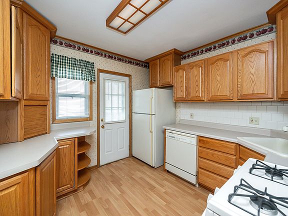 The kitchen features classic wood cabinets, ample counter space, and included appliances, making it practical and inviting. The spacious backyard is perfect for outdoor activities, featuring a deck for entertaining and a detached garage for extra storage.
