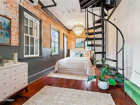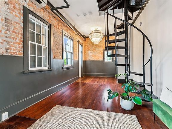 The first level offers a bright, open living area with gorgeous French doors that lead to your private balcony, overlooking a serene, secluded courtyard. The brand new kitchen boasts stainless steel appliances—including a gas range oven, dishwasher, refrigerator, and microwave—along with Quartz countertops and sleek finishes. Upstairs, an iron spiral staircase leads to a versatile loft space. Throughout the unit, you’ll find refinished antique heart pine floors, exposed brick walls, solid wood doors, and elegant chandeliers that create ideal French Quarter ambiance.