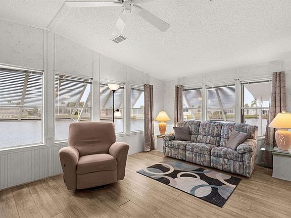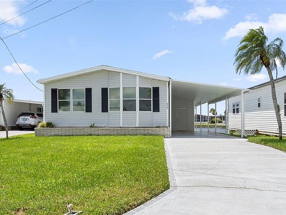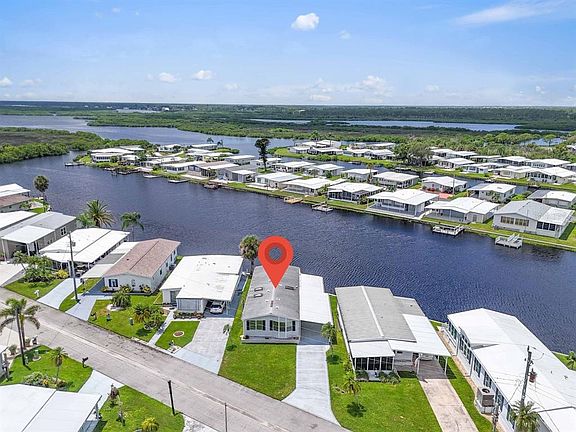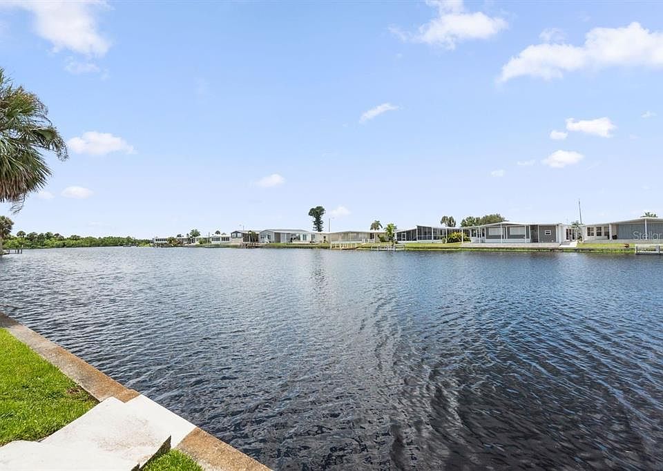 PRICE REDUCTION OF OVER $19,000! Enjoy everyday with the gentle shimmer of STUNNING CANAL FRONT WATER VIEWS from this RARE 3 BEDROOM, 2 bathroom retreat in Harbor Cove, an affordable 55+ waterfront community with GULF ACCESS. This spacious 1,341 sq. ft. FURNISHED home in the pet section invites you to unwind in a living room that opens to a wide canal, where manatees swim and herons perch just beyond your patio. The open kitchen and dining area offer generous counter space and cabinetry, perfect for preparing meals as sunlight filters through the skylights. A split bedroom plan ensures privacy in the large primary suite but also offers direct views through the living room access when desired. Two additional bedrooms near the hall bathroom make it easy for family and friends to be comfortable. Step outside and find your covered porch nearly at the water’s edge, perfect for gathering with friends for evening beverages, watching the boats go by or some backyard fishing. The HOA maintains the seawall and with a leasehold fee of just $99 PER YEAR, this is very affordable living in harmony with nature. Sellers have owned this property since 2017 and are unaware of any flooding to the home. Updates within the past 4 years include a new AC system, carport, siding, gutters, living room vinyl flooring, bathroom tile, renovated shower, and more. A long driveway, carport, and shed provide ample space for guests and gear. Beyond your doorstep is a 90-slip marina, amazing fishing and boating opportunities along the Myakka River, two swimming pools, a hot tub, bocce and shuffleboard courts and a 2-story clubhouse alive with dances, outdoor picnics, games, and community fun. Join the boat club or woodworking shop, participate in water aerobics and volleyball, craft classes, plays, etc. An optional fitness center, tennis/pickleball courts, boat slip and storage compound are also available. Located just minutes from beaches, restaurants, farmers markets, golf courses, spring training baseball, shopping and quality medical care this is one not to be missed! Schedule a private showing today.