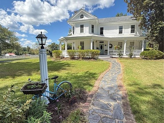 A rare opportunity to own Gravel Hill, a timeless estate on 9.8 agriculturally zoned acres tucked away on a quiet country lane, yet only minutes from shopping, dining, top-rated schools & highway access. Steeped in history, the home was built in approximately 1906 as a wedding gift. The current owners began a meticulous restoration in 1998, thoughtfully blending the home's historic character with modern luxuries. The grounds feature a stocked pond with bass and brim for fishing, a salt water pool, organic garden and 3 fenced pastures - an ideal property for equestrian buyers. The home offers approx 3,400 sq ft, living as a 5-6 bedroom home with a rare 1st floor primary suite with two bedrooms w/direct access to the deck overlooking the pond. The chef's kitchen was completely reimagined with a center island, stone countertops and recently replaced appliances from SubZero, Thermador, and Dacor. Entertain in the parlor with its original cast iron stove or the dining room with built-in china cabinets. The first floor also includes a den, breakfast room, laundry center & powder room. Upstairs, there are four bedrooms, a full bath and walk-in bulk storage. For over 25 years, the park-like grounds have been organically maintained making the 8-foot fenced-in organic garden with raised beds an ideal setting for growing vegetables. Enjoy sunrises from the expansive front porch or wander the property among the numerous fig, apple and mulberry trees. This home has been impeccably cared for with most recent upgrades including new upstairs high-end windows (2021), New Pella windows in the Breakfast room (2024), freshly paved drive (2025), new commercial grade Kitchen appliances (2024-2025), new pool liner (Summer 2025) and new saltwater system (2024). Owners have soft-washed the house, HVAC, septic & termite inspected making this historic estate truly turn-key for its next stewards. Gravel Hill has hosted weddings/engagement parties, graduations and even community events - making it not only a home, but a place of celebration.
