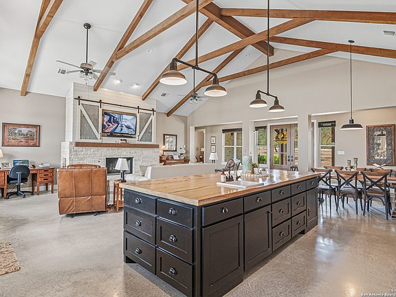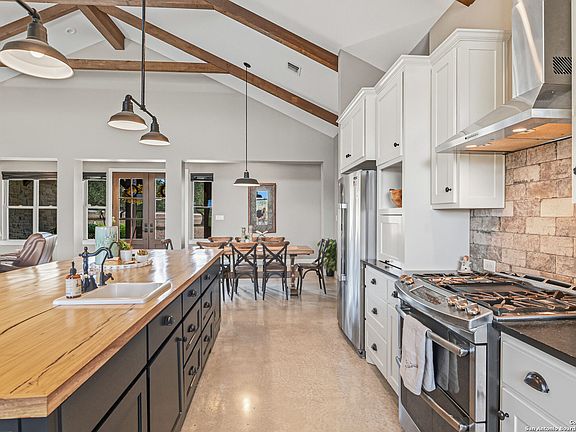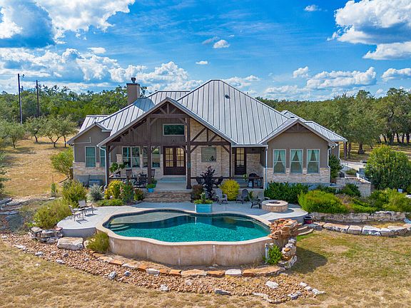 OPEN HOUSE 10/18 1-4PM. Are you looking for a private, low maintenance, move-in ready, thoughtfully customized, one story home with an amazing pool and patio to take in the fresh hill country air? Who doesn't? Be the neighbor everyone envies and make this home your own! It sits on 3 acres tucked away in beautiful Mystic Shores. This home has an open floor plan that is light filled with high ceilings, 3 bedrooms, 3 baths and a 2.5 car garage. The kitchen is a show piece, with a custom pecan countertop, prep sink and farmhouse sink and plenty of room for seating guests while cooking and entertaining. For the winter months, be cozy and warm with the focal fireplace, open beam ceiling and for the summer, enjoy the outdoor focal point of pool with waterfall and rinse off in your outdoor shower. No need to worry about privacy as this home backs up to a large ranch that borders the property to the North. Need a flex space? Take the stairs in the garage to a room upstairs you can use for storage, a gym, or finish out for an office or additional living space. The additional space measures approximately 18' x 15'. The property is fully fenced with an electric gate, located in the prestigious Mystic Shores community, top-notch amenities include two swimming pools, pickleball, tennis, basketball, and volleyball courts, a community center, two private lakeside parks with picnic areas and lakefront access, and a 200+ acre nature preserve. Here you can truly get away from it all but make your way to many favorite destinations such as New Braunfels, Wimberley, Fredericksburg and Canyon Lake. Come see for yourself how you can feel like you're on vacation everyday!
