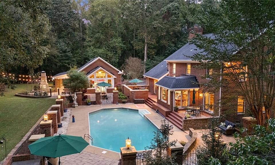 Tucked away on 3 private acres in Caroon Farms, this stunning all-brick estate is a rare blend of elegance, comfort, and nature. This 5 bedroom, 4 full and 2 half bath home offers a private guest, student, or in-law suite, a chef's kitchen, spa-inspired baths, and an oversized flex space. Outdoor living is unmatched-framed by lush blooms, the 15,000 gallon, two tier koi pond with a tranquil waterfall brings movement, sound, and serenity to the landscape. An outdoor fireplace, lpe decking, and paver patios complete the retreat-like setting. The in-ground pool is complemented by a 14'x14' all-brick pool house. The detached 3-car garage features a massive loft and atrium. Wildlife sightings, a zip line, and a play area add charm to this peaceful, high-end oasis. With hundreds of thousands invested in outdoor improvements, this property is truly one of a kind. Only 20 minutes to Norfolk hospitals and commerce-schedule your private tour today.
