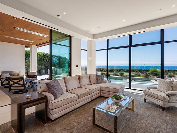 Expansive floor-to-ceiling pocket doors create seamless indoor-outdoor living, opening onto covered verandas complete with heaters, fireplaces, and sweeping ocean views. The living room features a dramatic floating stairwell and smart-home lighting, ideal for both quiet evenings and entertaining. For movie nights, retreat to the director's theater, or gather in the game room stocked with puzzles, books, and board games.
