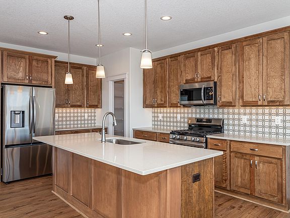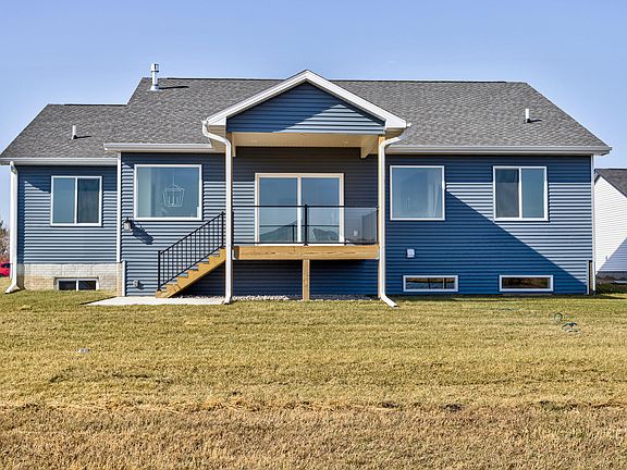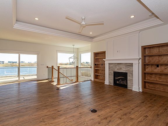 This newly built Bailey plan by Happe Homes offers a blend of modern luxury and small-town charm. Situated in a serene neighborhood with a city pond stocked with fish right through the backyard, this home features 5 spacious bedrooms and 3 bathrooms with over 3100 finished sq ft. The basement is perfect for entertaining, complete with a wet bar, large rec-room, and ample storage. The primary bedroom is a true retreat, boasting a view of the pond, a large walk-in closet, and a bathroom with stunning tile throughout. Enjoy your meals in the dining area with direct access to a covered deck and open patio, perfect for outdoor gatherings. The inviting foyer at the front door provides a cozy space to enjoy your morning coffee. The three-car attached garage is heated and features epoxy flooring, making it both functional and stylish. With plenty of east-facing windows, you can wake up to beautiful sunrises every day. The open kitchen features a large island, abundant cabinetry, and a walk-in pantry equipped with electricity for additional utility. The living space was meticulously designed from the beautiful wood finishings, floor outlets, gas fireplace, inset bookcases and the tiered ceiling for that special modern touch to a cozy space.