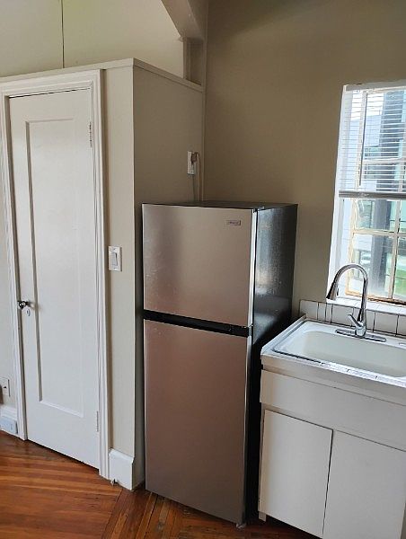 Private shared courtyardTwo-tone paint jobRemodeled efficiency kitchenCrown moldingsSunny small studioHardwood floors