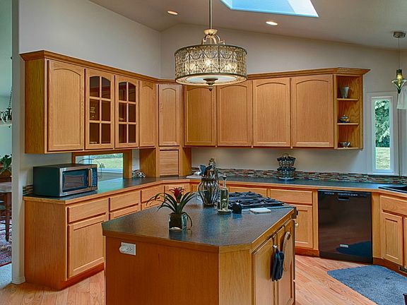 Work from home or welcome guests in the large detached garage/shop/office/living areas. Immense possibilities await you in this desirable locale: 10 minutes to Sunset Square/The Guide, and a 5 minute private walk to Harmony Elementary. Soaring windows and skylights bring the outside in; or bird watch from your 800 sq. ft. deck with built-in seating and sound. Fenced yards provide secure spaces for your critters or gardening pursuits. Welcome Home!