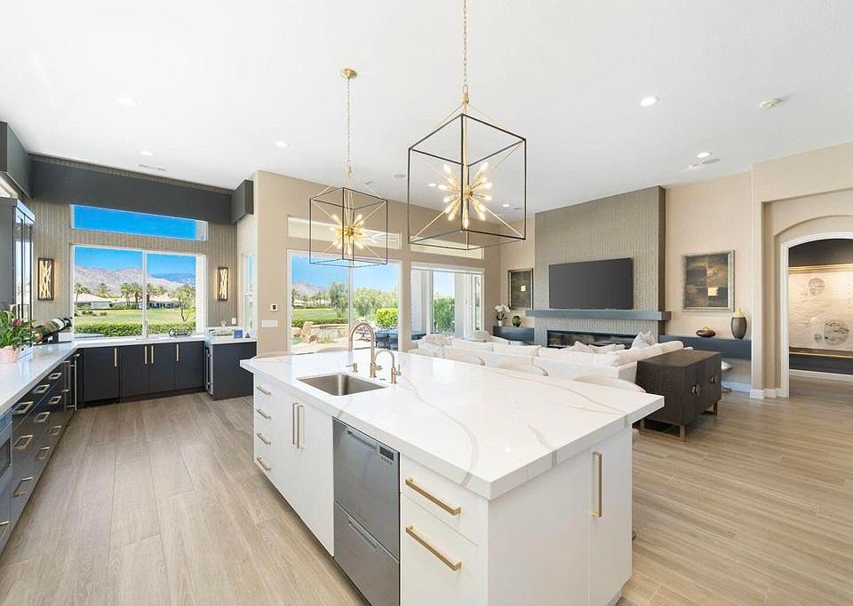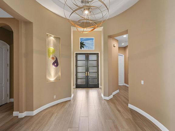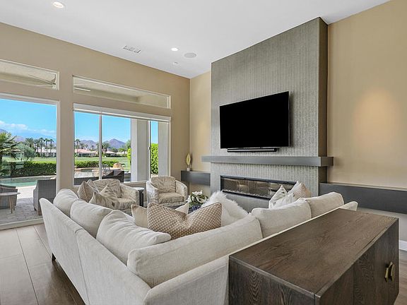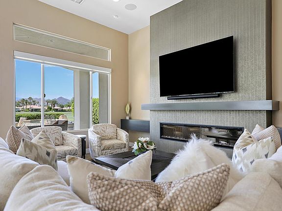 Looking for the show stopper!? THIS IS IT! Fully remodeled Sedona floor plan with jaw dropping mountain views over 2 fairways, grants this home with a special one of a kind allure! No detail was overlooked when renovating this property. When entering, you are welcomed by an enhanced entrance & grand entry double doors as you are greeted with spectacular views, tall ceilings, new flooring, foyer chandelier, graceful glass wall sculptures. This home is adorned with contemporary decor including exquisite custom cabinetry, stunning lighting fixtures, large modern glass fireplace. You will be enticed by a truly entertaining home featuring a gourmet kitchen that expands the length of the entire great room anchored by a bar overlooking the golf course with 2 wine refrigerators & ice maker. The kitchen features large island, new 5-burner Thermador gas cooktop, 2 Fisher & Paykel drawer dishwashers, Zephr hood fan, Sharp drawer microwave as well as Kitchenaid refrigerator & oven. Entertain in formal dining room or on the patio with new BBQ island featuring fire magic windowed BBQ, fire pit, modern patio furniture, new landscape & lights to enjoy breathtaking sunsets. The primary bedroom ensuite includes spa-like bathroom large porcelain tiles, tub, large shower, quartz countertops with exceptional lighting fixtures. The two guest rooms include ensuites, one is currently set up up as an office. An enclosed den/flex room provides optional sleep area for guests with built-ins including desk & closet. Bosch washer/dryer. This stunning home is being offered furnished per the sellers inventory list. One last bonus, it also has a Tesla EV charger!