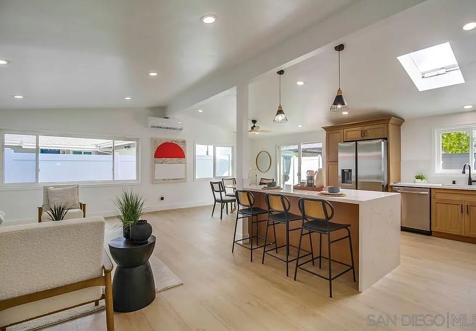 Immaculate home in highly desired, centrally located North Clairemont neighborhood. Exquisitely renovated inside and out, with high attention to detail and quality. Almost Everything is new. State of the art, gourmet kitchen, with white oak cabinets, quartz counters, huge island and new, stainless steel appliances. Beautiful tiled bathrooms, adorned with white oak cabinets, quartz counters, back splashes and rain shower heads. New dual pane windows have been installed throughout the house. House is bright and cheery, with plenty of natural light, plus addedd recessed lighting throughout. The powerful mini split system keeps the whole house cool in the summer and warm in the winter, plus there are ceiling fans in the bedrooms and dining area. Designer luxury vinyl plank enhances the floors in all rooms. Sliding door opens to expansive back yard, featuring a large, impressive gazebo and beautiful, nicely lansdscaped, maintenance free and water free artificial turf in the front and backyards, which can save you $ 150 - $ 200 / mo in water and maintenance costs. Home is centrally located and conveniently close to schools, shopping, entertainment, the beach and many attractions. This truly is a one of a kind home in a very tranquil street, with very friendly neighbors. Come make it your own !