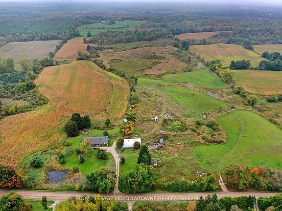 Are you looking for a blend of residential comfort with a 98 acre rural opportunity? This could be the location for you. Welcome to 5167 Fifth Line located in the south central rural portion of Erin township. An expansive 98-acre property located just north of Wellington Road 50 , 5minutes from Ballinafad. Whether you're envisioning a private retreat or an entrepreneurial venture, this location offers endless possibilities. The property features 55 workable/farmed acres currently planted in corn. HST is included in the purchase price. The current farmer will harvest the crop this fall, leaving you with a clean slate in the spring, or continue to rent the land to the farmer. Built in 1991 this custom modular pre-fab bungalow built by Quality Homes features 3 good size bedrooms, 1,826 square feet on the main floor that is waiting for your personal touch and in need of TLC. With an attached single-car garage, two full bathrooms, one powder room, and an unfinished basement, there is room to create something special here. The essentials are in place-forced air gas furnace (2011), well, septic pumped and inspected in 2024, 200-amp breaker panel plus a pony panel to service the steel Quonset outbuilding measuring 55'x38' sitting on a concrete pad. This building adds to the functionality of the property, perfect for storage or a workshop. Located in a serene rural setting, yet close enough to town, this property is a rare find. With some land clearing and tile drainage, there's potential to expand the workable land by another 10-15 acres. Spend time by the pond and enjoy the sounds of Sandhill Cranes, Deer, Turkey, Ducks and Geese. The spring peepers may even become your new favorite band. If you're seeking a peaceful lifestyle with room to grow, this could be your perfect match. **EXTRAS** Features a Quonset building 55'x38' with hydro and concrete floor. This custom home was built by Quality Homes, inside a factory, and installed on the lot in 1991.