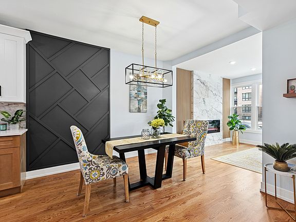 Modern recessed lightsBrand new flooringSpacious kitchenQuartz countertopsDining spaceShaker style cabinetsCustom made wainscot paneling