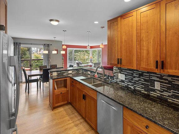 Welcome to this beautifully updated 4-bedroom home in the heart of Edina! Step inside to find a bright, open layout centered around a stunning designer kitchen with rich cherry cabinetry, stainless appliances, a gas range, and a breakfast bar that connects seamlessly to the dining and living spaces. Sun-filled south-facing windows create a cheerful, airy feel throughout. Three bedrooms and a full bath are conveniently on the main level, while the walk-out lower level expands your living space with a 4th bedroom, stylish ¾ bath, wet bar, and spacious family room—perfect for movie nights or gatherings. Step outside to a large patio and private backyard backing to Nine Mile Creek for peaceful views and connection to nature. Enjoy peace of mind with thoughtful updates including a remodeled kitchen (2014) and baths, Marvin windows, new cement board siding, refinished hardwoods, and new furnace and A/C (2020). Move-in ready and minutes from scenic trails, golf courses, and Edina’s best dining! The perfect blend of comfort, style, and convenience.