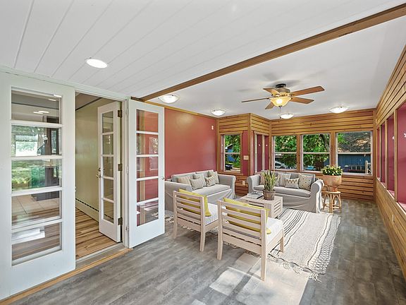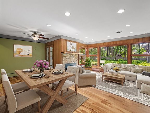 Step into this one-of-a-kind ranch home, beautifully set on a wooded .86-acre lot that blends comfort, charm, and natural serenity. The open-concept living and dining area is wrapped in rich wood accents and hickory floors, anchored by a stone wood-burning fireplace. The adjacent 3 season porch is perfect for summer nights. Walls of oversized windows in both the living room and porch flood the space with natural light and frame picturesque views of the private, tree-lined yard—bringing the outdoors in. The spacious kitchen features stainless steel appliances and a commercial-grade stove, all adjacent to a mudroom with radiant heat just steps from the dining room. The primary suite offers bamboo floors, a walk-in closet, and a beautifully tiled private bath. A second bedroom includes a built-in office for today's flexible lifestyle and finishing out the main floor is a third bedroom and full bathroom. The lower level expands your living space or makes for a great guest suite with a cozy family room, and second primary suite with slate-tiled full bath plus a large laundry room, storage and and charming canning cellar. Outdoor lovers will adore the bluestone garden paths, three-season porch overlooking wildlife and gardens, and the variety of plantings—apple trees, strawberries, raspberries, herbs, hops, honeysuckle, and perennial flowers.