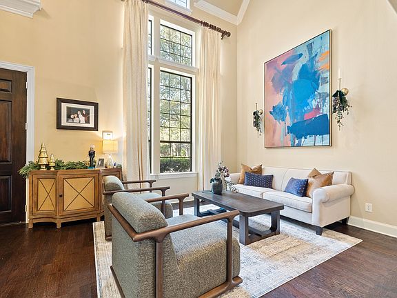 This 4-bedroom, 6-bath custom home offers a warm transitional style with soft contemporary touches and a clean stucco exterior. Thoughtfully maintained and updated throughout, the interior features hand-scraped hardwood floors that guide you from the foyer into a private study with built-ins, positioned across from the formal sitting and dining rooms.