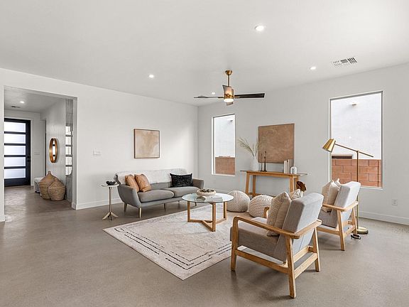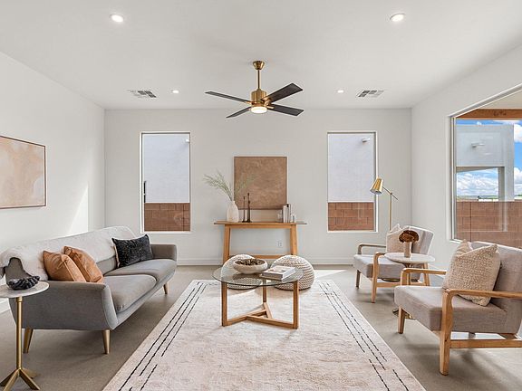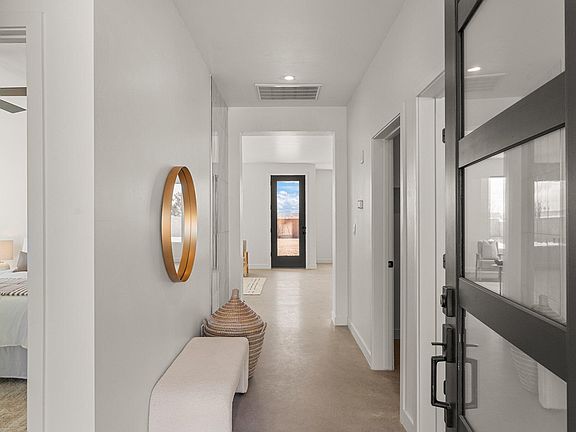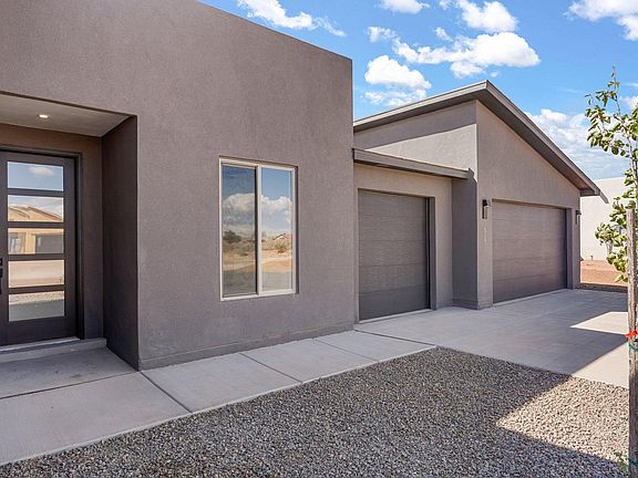 Fellowship Homes newest model the Neoteric floor plan with 4 beds, 2.5 baths and 3 car garage! Situated on a 0.5 Acre lot with NO HOA or PID in Sunny Rio Rancho! Finished with a mid-century chic vibe, this single level home has polished concrete floors, solid wood cabinetry, quartz /granite counter tops and designer accents! You will find 3 beds in front of the home with a full bathroom that features tile surrounds and quartz counters! Open kitchen living dining gives you a light and bright space and features access to large back covered patio for maximum entertainment. Primary suite is tucked away in back of home and featuring a luxury ensuite with large double vanity with tile backsplash, oversized shower with designer layout and walk in closet! Schedule a tour your dream home today!