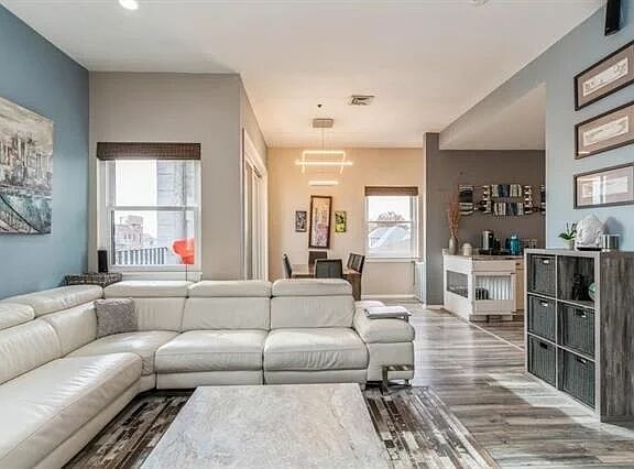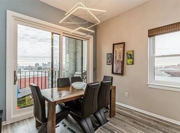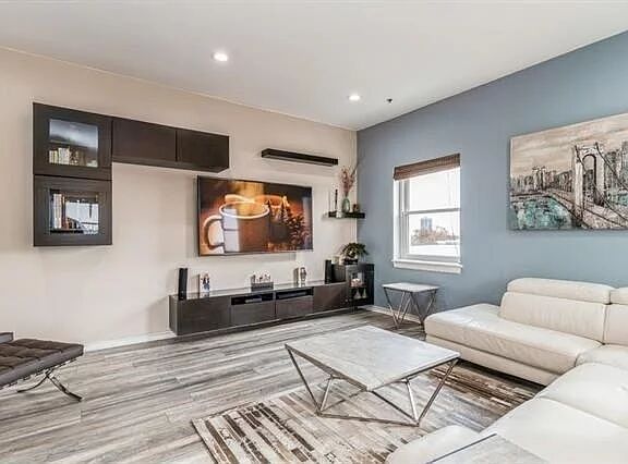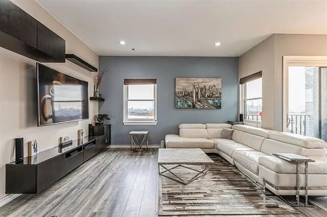 This spacious 1620 square foot corner condo home boasts 2 bedrooms and 1.5 bathrooms, offering breathtaking unobstructed NYC views from its expansive terrace. The open floor plan is perfect for entertaining, and the unit features stainless steel appliances and a convenient in-unit washer and dryer and one assigned indoor parking spot with other parking spots available to rent at an additional cost. Located just two blocks from James J. Braddock Park and the vibrant shops on Bergenline, this commuter-friendly location is surrounded by public transportation options.