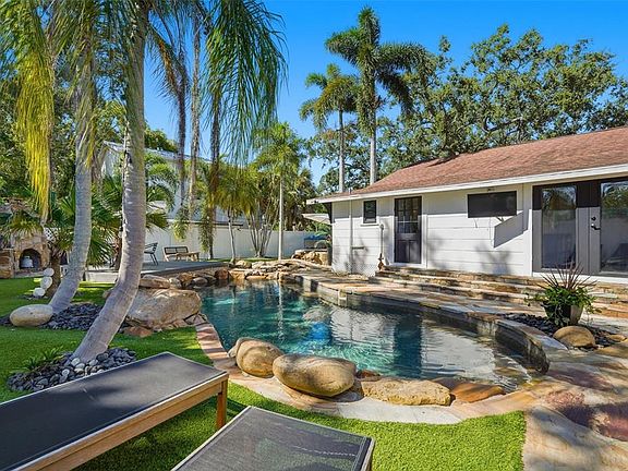 Embrace the Crystal Beach lifestyle in this mid-century-inspired bungalow where resort-style outdoor living meets everyday comfort. Just one block from the Gulf and directly across from a scenic park with a brand-new pier, this rare four-bedroom, three-bath home sits safely outside the flood zone and has remained untouched through recent storms. Zoned for A rated Palm Harbor School District. Blending clean design with natural textures, the interior captures a warm, modern feel that’s both inviting and low-maintenance. Thoughtful updates — including new impact windows, dual-zone air conditioning with a recently replaced main unit, and updated mechanicals — offer everyday comfort and peace of mind. Outside, the home unfolds into a private, spa-like retreat. The front and back yards have been fully reimagined with dog-friendly turf, stone hardscaping, and a heated pool and spa that flow together through a river-run spillway beneath an arched bridge. The setting is anchored by a stone fireplace lounge, surrounded by lush greenery and ambient lighting that transforms the space into a true boutique-style resort — perfect for entertaining or unwinding in complete privacy. A flexible fourth bedroom with its own ensuite bath adds versatility — ideal for a home office, guest suite, or quiet studio tucked apart from the main living areas. Set in the golf-cart-friendly community of Crystal Beach, known for its laid-back rhythm and local charm, you’re just steps from the famous Pinellas Trail and home to the best sunsets in Pinellas County. It’s a rare blend of style, serenity, and freedom — with no HOA. One visit and you’ll see why this property feels equally at home as a hidden getaway or a family haven along Florida’s most charming stretch of coastline.