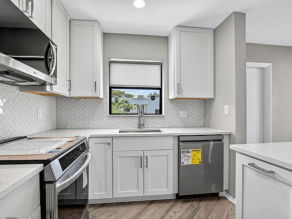 Exquisitely renovated 2BR/2BA condo in Town & Country Estates, Delray Beach. This modern luxury residence features a gourmet kitchen with all-new wood cabinets, quartz countertops, ceramic backsplash, Kraus sink, and top-of-the-line LG smart appliances. Diagonal gray flooring and new window treatments throughout, complemented by recessed LED lighting, ceiling fans, and custom cabinetry. Both bathrooms fully remodeled with elegant vanities, ceramic sinks, glass shower doors, and updated fixtures. Oversized new washer & dryer, A/C (2022), water heater (2021), all new doors and hardware, and fresh paint throughout. New roof! No assessments. Community pool. Move-in ready!