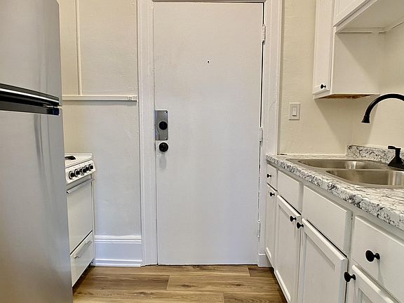 Large remodeled and open apartment facing park & lake. Spacious bedroom, high ceilings, built ins & more. Laundry on site & off street parking. Water & Trash removal included.