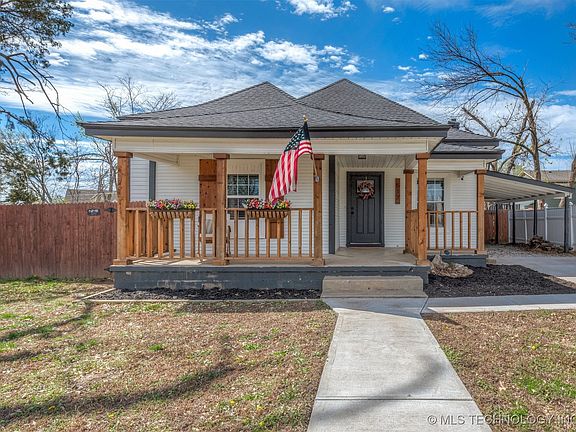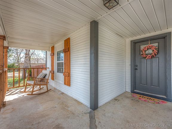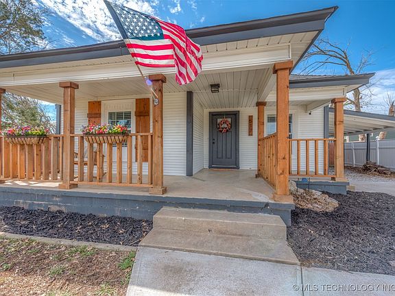 This charming 3 bedroom, 1 1/2 bath home is situated on a spacious lot offering convenience to downtown shopping, restaurants, schools, churches and the Will Rogers Turnpike making Tulsa a quick 20 minutes away. Inside you'll find a cozy wood-burning fireplace, generous living room with tray ceiling and wood beams and new luxury vinyl plank flooring throughout. Barn door slider provides privacy to the primary bedroom. The large yard is fully enclosed with a privacy fence, firepit with crushed rock for chairs remains along with two storage buildings. 21 concrete piers were recently added under the house for additional support. Carport parking and a large front porch made for rocking chairs awaits the new Owner.
