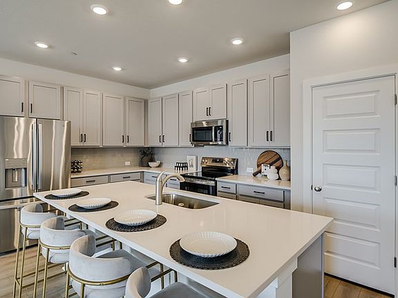 A sleek, modern kitchen sits at the center of the home. Pairing clean white cabinetry with warm flooring and a chic ivory backsplash, it blends style and practicality effortlessly.