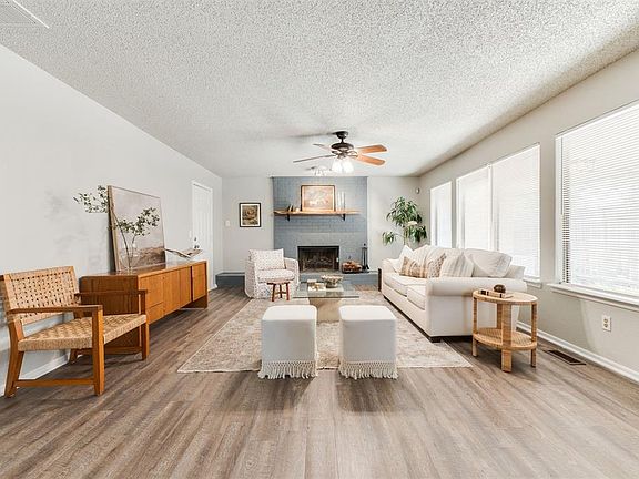 The entire home boasts a fresh and vibrant atmosphere with new paint and flooring throughout. On the left, discover the 3 cozy bedrooms and a guest bathroom, providing a comfortable and private space for family or guests. To the right, the open-concept living room, dining room, and kitchen await. The living room is bathed in natural light and features a generously sized fireplace, creating a warm and inviting focal point.