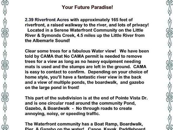 Your Future Paradise: 2.39 Riverfront Acres with approximately 165 feet of riverfront, a raised walkway to the river, and lots of privacy! Located in a Serene Waterfront Community on the Little River & Symonds Creek, 4.5 miles up the Little River from the Albemarle Sound!