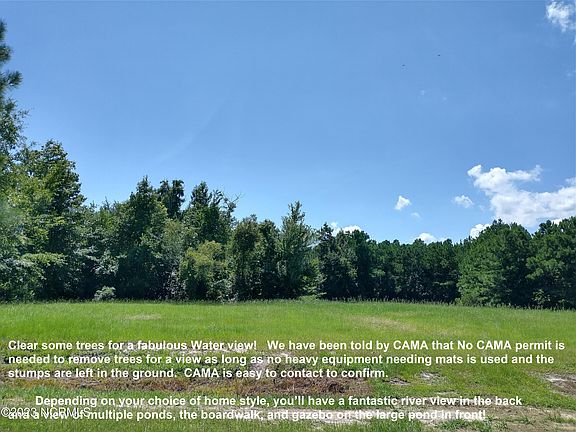 Clear some trees for a fabulous Water view! We have been told by CAMA that No CAMA permit is needed to remove trees for a view as long as no heavy equipment needing mats is used and the stumps are left in the ground. CAMA is easy to contact to confirm. Depending on your choice of home style, you'll have a fantastic river view in the back and a view of multiple ponds, the boardwalk, and gazebo on the large pond in front!