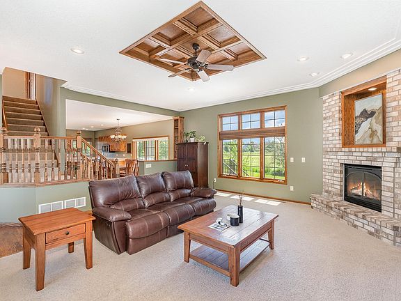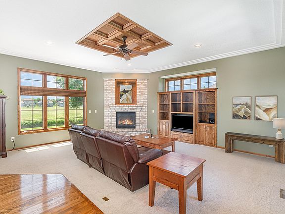 Step into comfort, space, and style—this stunning home has it all! From the moment you arrive, you’re greeted by pristine landscaping, in-ground irrigation, and elegant stamped concrete accents. Inside, natural light pours into the open-concept living room featuring a brick fireplace, custom built-ins, and a one-of-a-kind tray ceiling with wood inlay.