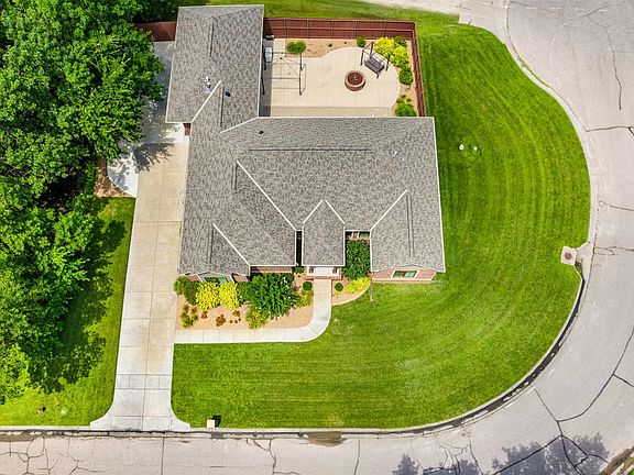 Tucked away on a secluded cul-de-sac in sought-after Springdale Lakes, this custom home, built in 2017, offers an exceptional blend of refined finishes, smart functionality, and peaceful surroundings. From the moment you arrive, the manicured lawn, 8-foot entry door, and inviting front porch set the tone for a home that’s as beautiful as it is well-crafted. Inside, the open-concept living space is elevated by 10-foot ceilings, wide-plank hardwood floors, and elegant triple-stacked crown molding. The gourmet kitchen is a true showpiece, featuring imported Italian Calacatta Gold marble countertops, a striking butcher block island made from West African Sapele wood, stainless steel appliances—including a 5-burner gas range, built-in microwave, and built-in wine cooler —and a generous walk-in pantry. The split-bedroom layout ensures privacy, with two secondary bedrooms connected by a Jack-and-Jill bath, each with its own vanity and walk-in closet. The primary suite is a luxurious retreat, offering a spa-like ensuite with a lighted jetted tub, glass-enclosed dual shower, Italian Calacatta Gold marble-topped double vanity, heated towel rack, and wall-mounted TV. The oversized walk-in closet provides abundant storage and organization. Downstairs, enjoy a full theater experience with a 120” backlit screen, dual-base surround sound system, and tiered seating—perfect for movie nights or entertaining. Nearby, a steel-reinforced storm shelter offers peace of mind during severe weather. This home is built for comfort and efficiency, with dual-zone Carrier HVAC systems, spray foam insulation in exterior walls and crawl space, a Generac whole-home gas-powered backup generator ensures you will never be left in the dark, and a fully insulated garage with belt-driven doors and built-in shelving. Whole-home audio speakers are integrated throughout—including the patio and garage—and the exterior is secured by a complete surveillance system. Step outside to over 1,500 sq ft of partially shaded patio space with a gas fire pit providing ambience and heat but no smokey smell to carry inside with you. As you can see from the overhead photos, there is room to expand the backyard outside of the 9-ft privacy fence if you are needing a grassy area to enjoy and entertain. A sprinkler system fed by an irrigation well keeps the landscaping looking pristine. Situated minutes from K-96 and Kellogg with quick access in and out of the neighborhood via 143rd or 127th, this home combines high-end living with everyday convenience. Built in 2017 and meticulously maintained, it offers the feel of new construction—without the special taxes.