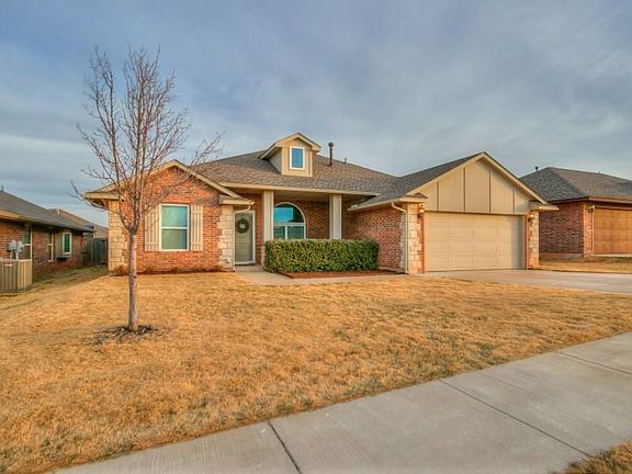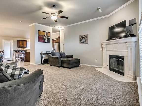 Beautiful home with an open floor plan! This home is super clean and the seller painted and replaced carpet just before listing. Spacious covered front porch and covered back patio. Home is a 4 bedroom, 2 bathroom. The 4th bedroom could be used as an office or playroom. The living room is spacious, easy to arrange furniture, and comes with a beautiful cast stone fireplace. The kitchen includes a large dining area, stainless steel appliances, pantry, under cabinet lighting, granite countertops, and breakfast bar. The master suite includes double sinks, and separate tub and shower. The master closet is huge! Storm shelter is located in garage. You will love this home, it has a lot to offer!