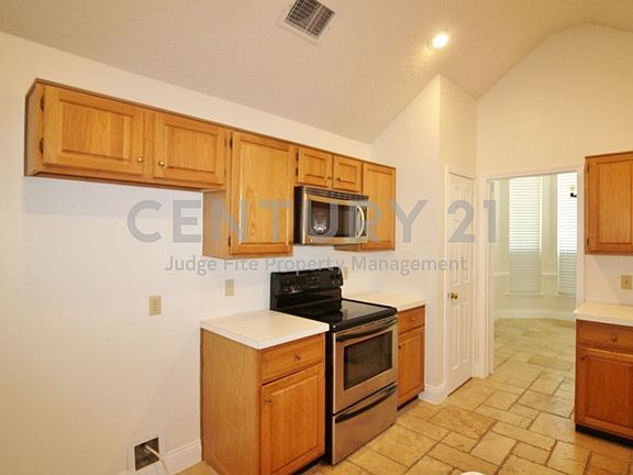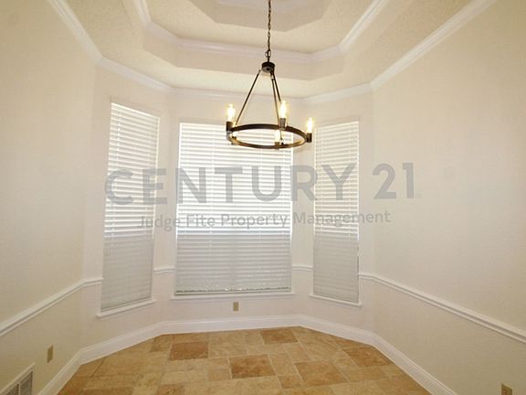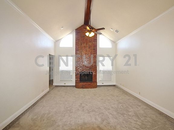 This beautiful brick 3/2/2 residence offers a fantastic layout and desirable features throughout. From the spacious living room with its vaulted ceiling, skylights, and floor-to-ceiling brick fireplace, to the lovely primary suite, this home is ready for your personal touches. Front entry leads to the elegant formal dining, defined by a tray ceiling, decorative wainscoting, and a stylish chandelier, with ample natural light from the bay windows. The living area features a focal point fireplace and large arched windows create a stunning and inviting atmosphere. The kitchen offers lots of cabinet and counter space along with appliances including a built-in microwave, dishwasher, disposal and stove. Your spacious primary suite boasts vaulted ceilings, plush carpet, and great natural light. The primary bathroom includes separate vanities, jetted tub. separate shower and walk-in closet. A private backyard patio area is perfect for outdoor enjoyment, and the property includes a detached rear-entry garage. This home offers a perfect blend of comfort and style in a desirable location. Come see all the wonderful features this home has to offer! No pets please.